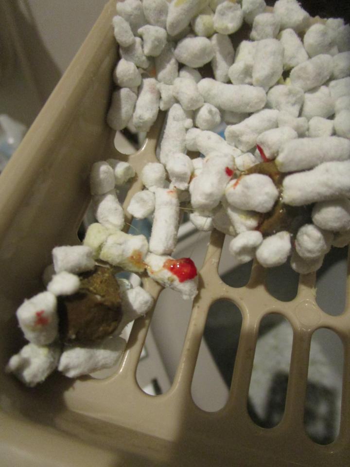 「それでこの血便どーしましょ。いつもよりカエルの卵っぽく全体が赤い感じなんですけど」
