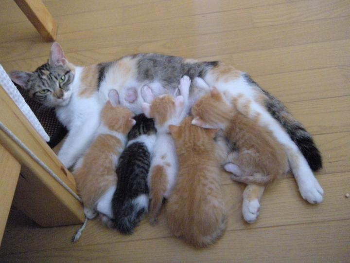 その後、ララの娘ネコ「まーこ」が、5/29に赤ちゃんを5匹産みました。