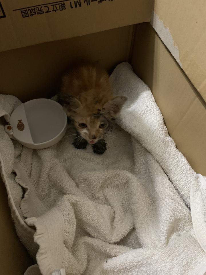 少し明るい場所で見る『泥を纏った』子猫の姿にびっくりして息を飲みました。腕や耳にびっしりとこびりつき、外灯の下で黒く光るものの正体がエンジンオイルだとこの時初めて気が付きました。あぁ、どうしよう。この子は一体どうしたら。おどおどしながら子猫に手を伸ばそうとすると、シャーッと威嚇をし1歩後ろにさがります。正直エンジンオイルの付着が成長や身体にどんな影響があるのか素人の私には分かりませんでしたが、害があることは間違いないはず。私は頭の中で必死にこの子の助かる道をシュミレーションしていました。泥じゃなくてオイル。雨じゃ絶対に落ちない。ずっと鳴いてるのに誰も迎えに来てない。万が一の場合この子は誰が生かしてくれるのか。誰が。