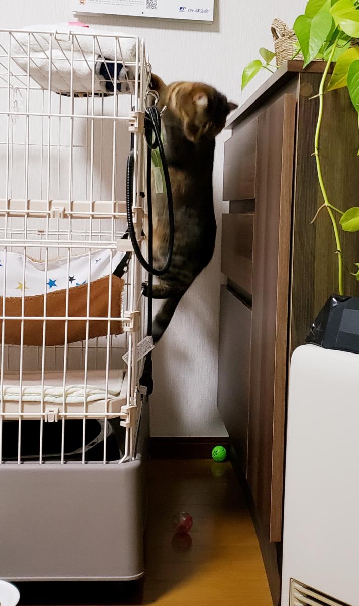 棚の上に何かあるのかな?とケージに登ってみたり...