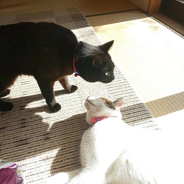 三毛ちゃんから、ちょっかいをかける事もあるけど、そうなるとジジは遊んでくれた~と思ってヒートアップし、結局最後は三毛ちゃん怒る💢