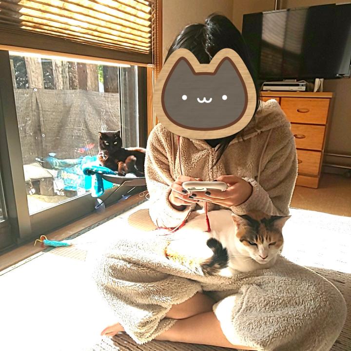 娘の上で寛いでいる三毛ちゃんにちょっかいをかける息子💦