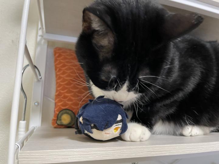 虎徹さんはお気に入りのぬいぐるみを取りに棚に登り目的を果たす