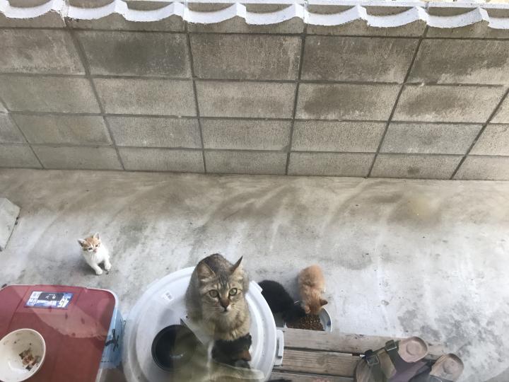 初めは、お父さん猫だけが来ていてご飯をたまに食べてどこかに行ってたんですが、そのうちお母さん猫も来るようになって、仲良くなり始めた頃に、1匹小さい小さいのを咥えて連れてきました(笑)