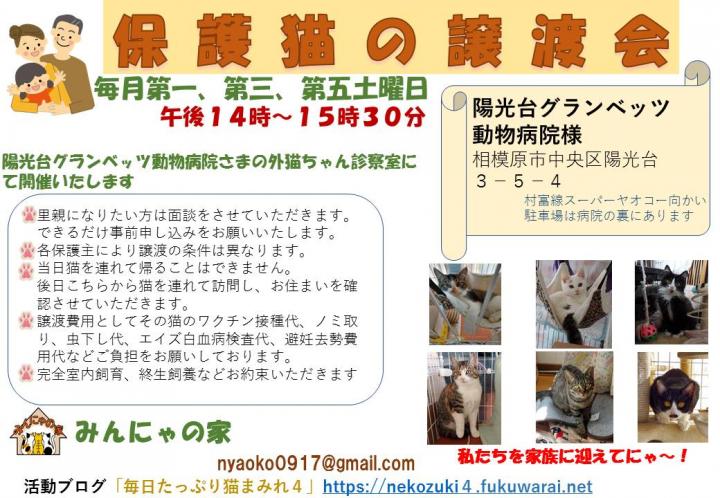 譲渡会は毎月第一、第三、第五土曜日の午後14時から15時半の時間帯で、相模原市中央区にあります陽光台グランベッツ動物病院様の外猫さん用診察室をお借りして譲渡会を開催しております。