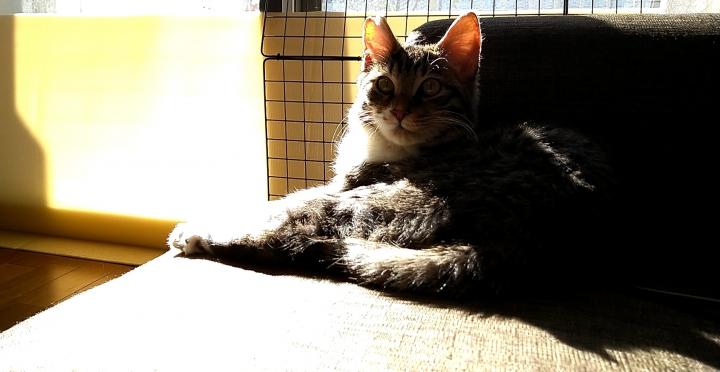 今日は知らないうちに暗い狭いところから出て、ソファで堂々とひなたぼっこしてた☀
