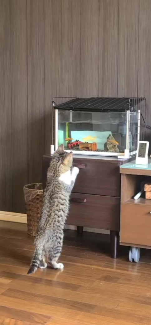 水槽の場所が変わって低いところに置かれたと思ったら、夜は目隠しされて、視界がひらけると猫が肉球でタスタス狙ってくるスリリングな生活に。
