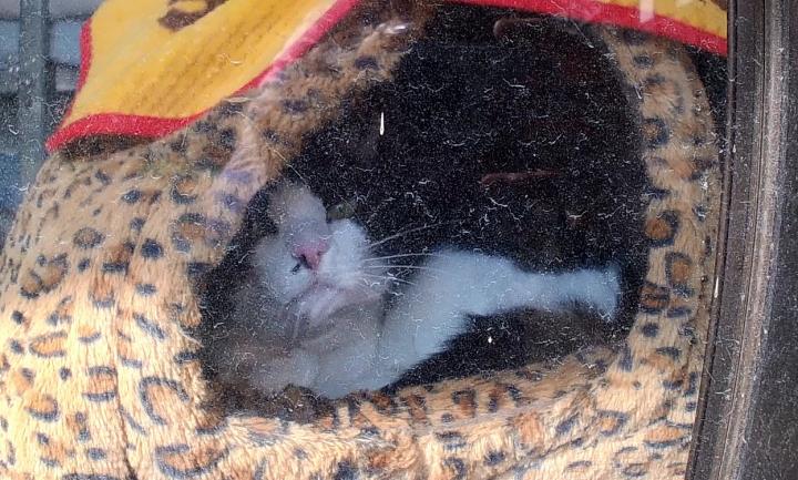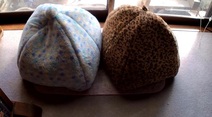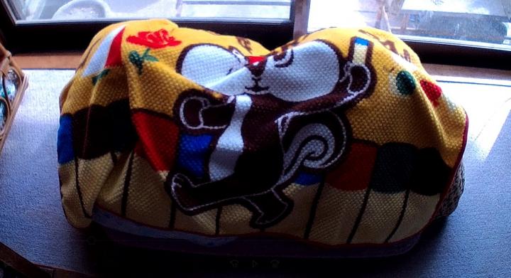 貰いもののひざ掛けをのっけて、さらに暖かく。