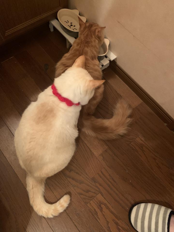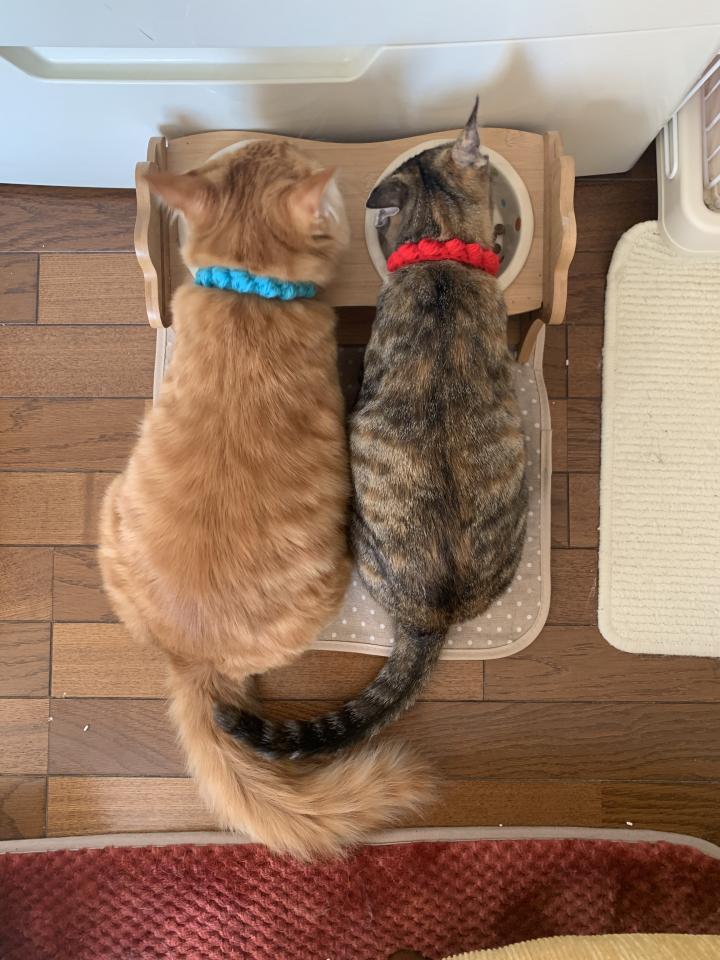ご飯皿の隣にもお水を用意してありますが、私が洗面所で顔を洗ったりしていると、みんなでお湯を飲みに来るので、猫用の水皿を用意しました😊