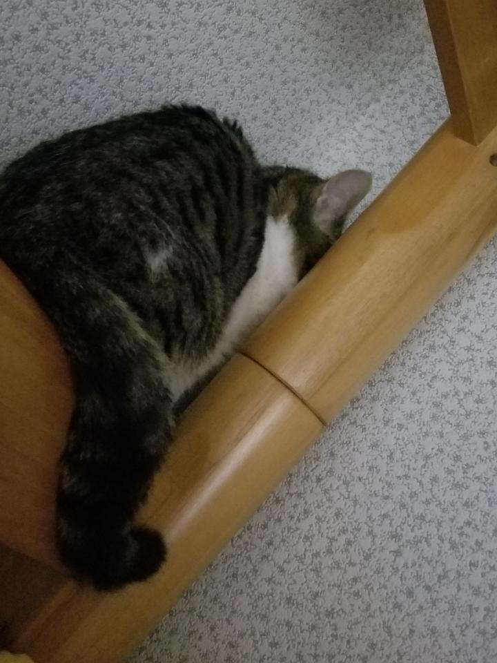 新しい場所と人間が怖いのか家具裏へ隠れたまま出てこず…。