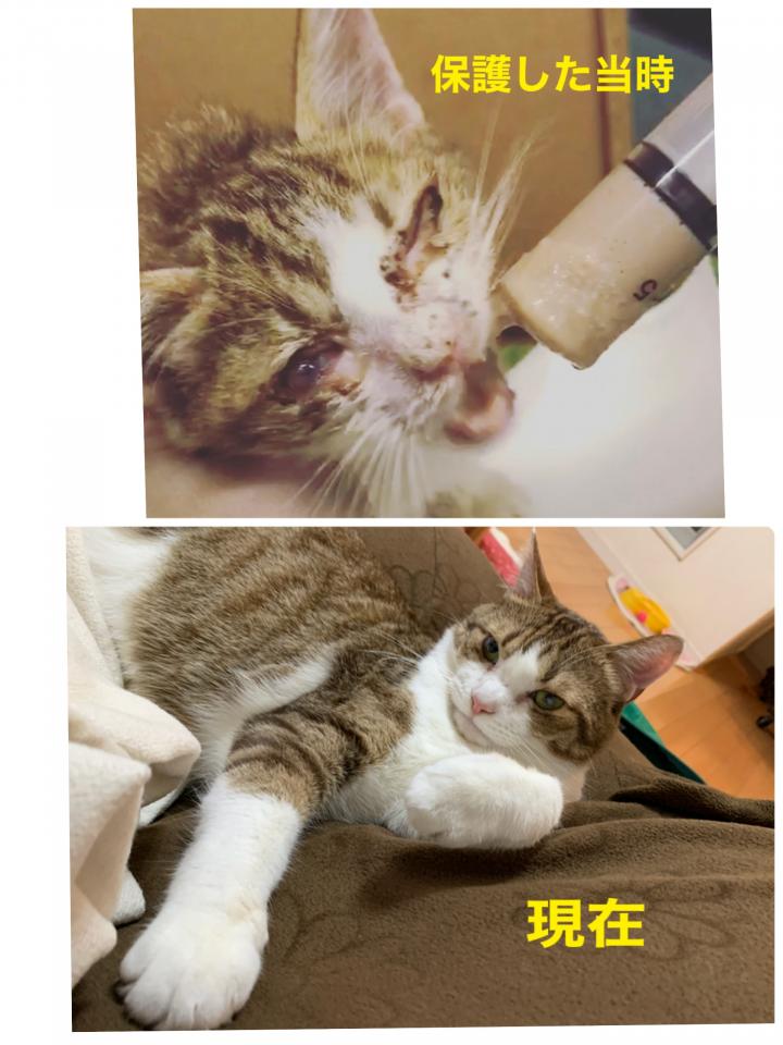 癒しの愛猫ですが、保護された時は瀕死の状態で母猫からはぐれたのか、彷徨い、道行く人にすがりついていたそうです。運良く、施設スタッフさんが見かけてすぐに保護、病院に連れて行ったら、もう、1日遅かったら命はなかっただろうと、感染が目にもきて、右目は失明するかもしれないくらい重篤だった様です。しかし、保護施設の方の献身的な看病で、半年後には譲渡に出せるくらい元気に…