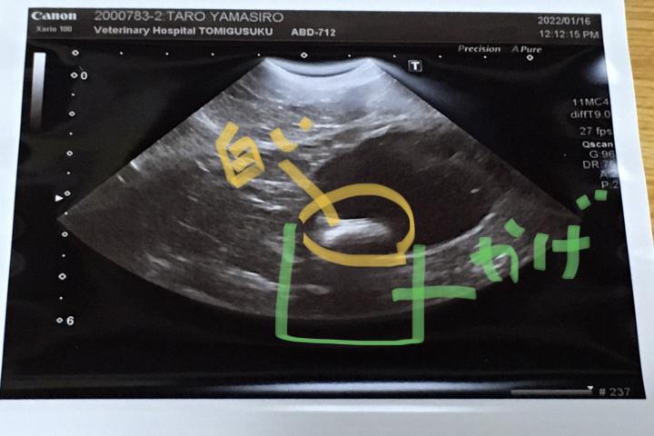写真私がマーカーいれましたが、白いのは明らかに結石だろうと。