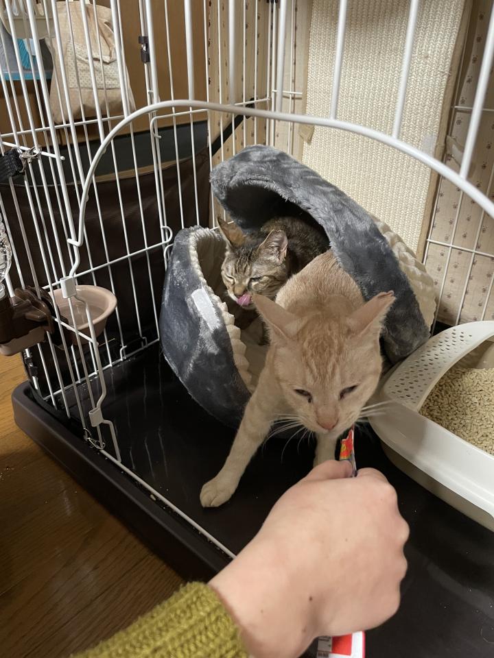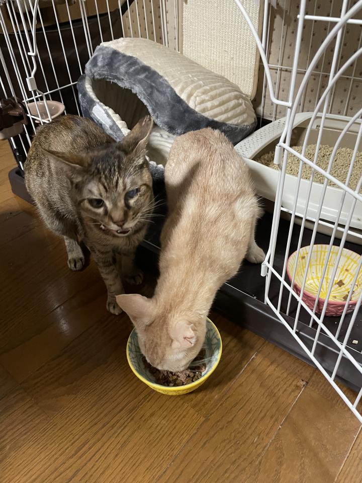 ケージの外でごはん食べてますが、すぐにまた引っ込んじゃいます。