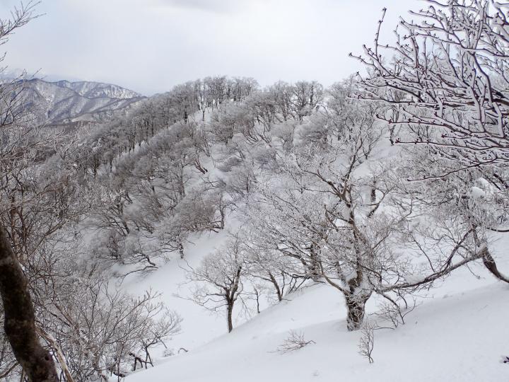 ふわふわの雪になり周りの景色も本格的な雪山に。