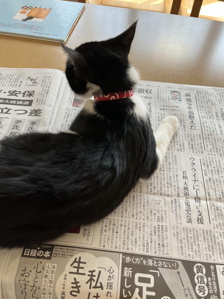 新聞を読んでいると必ず紙面の上に乗ってきます。可愛い