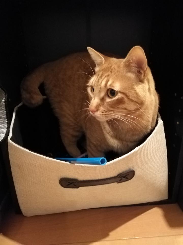 息子のおもちゃ箱なのに、ちゃっかり自分のおもちゃを入れたたけ君。