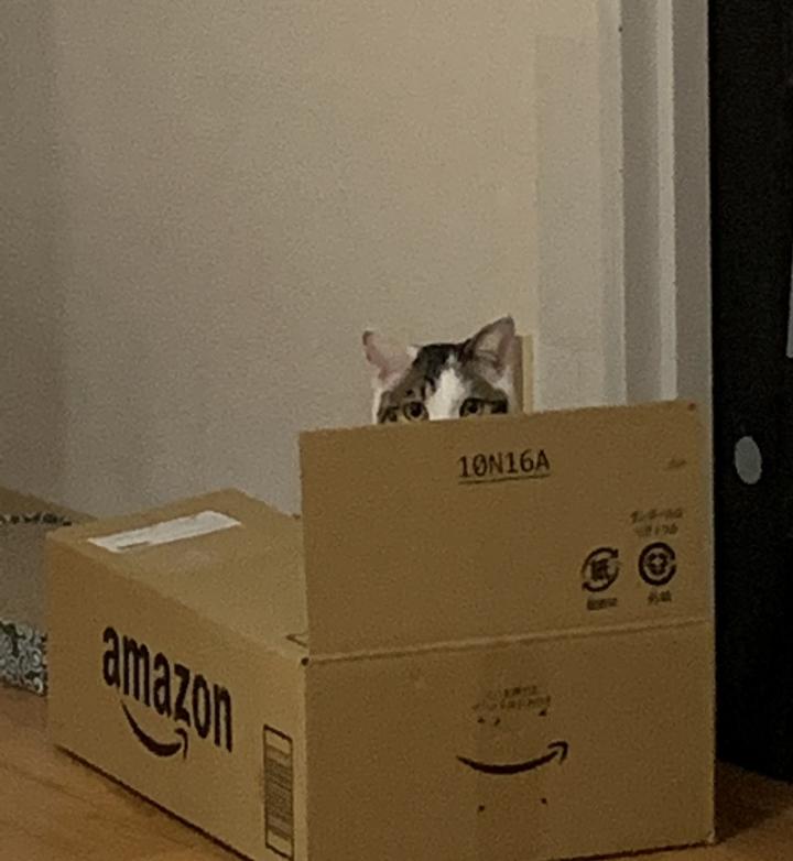 ダンボールを置いて気を紛らわせてもらってたんですが、こっち見てました。