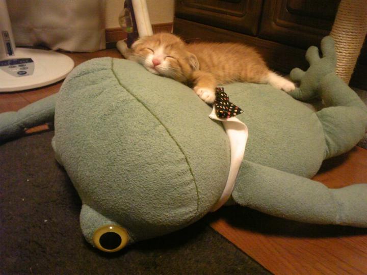 カエルの縫ぐるみをベットにして寝る福ちゃん