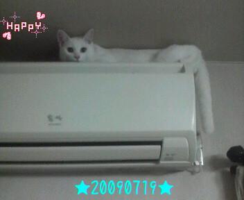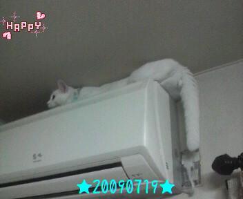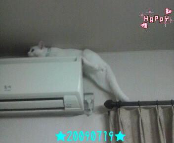 カーテンによじ登り、レールをつたってエアコンの上に(+o+)