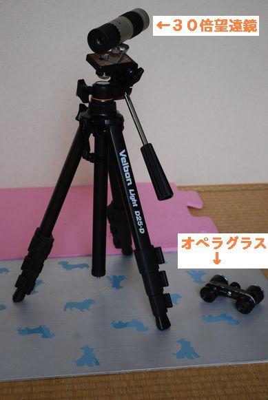 メトロハットの前、三脚付き望遠鏡&オペラグラスで見上げる