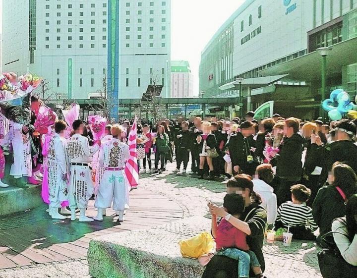 ちまさん生誕を祝うため、岡山駅に集まる若者たちの様子。