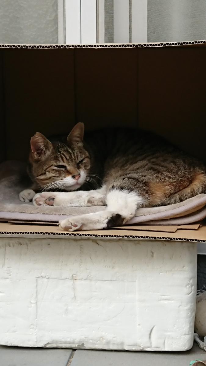 お庭にあるネコ3号ハウスで寝ているネコ3号
