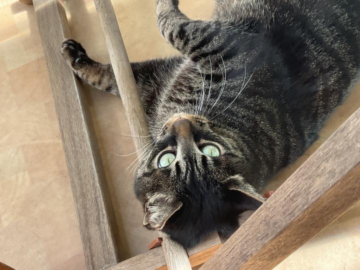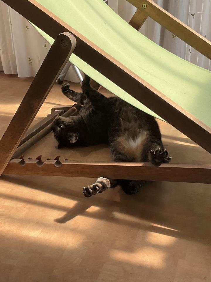 暑いのにくるみくんはサンルームでした、ただしリラックスチェアの陰に隠れて寝転ぶ感じ。