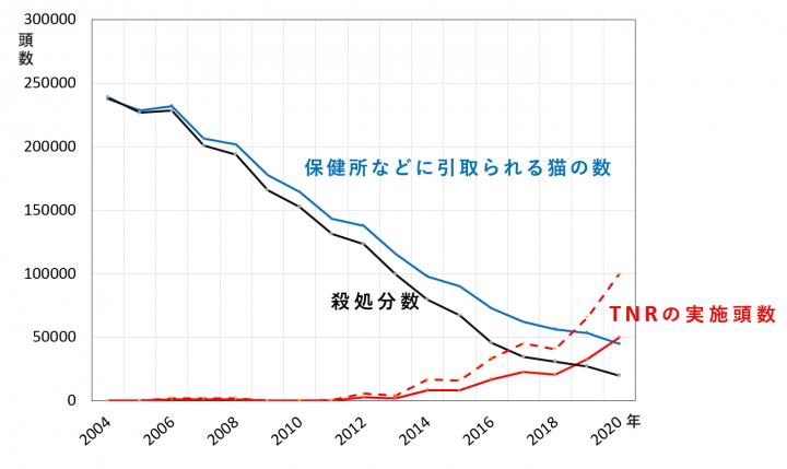 グラフは、TNRが「保健所などに引取られる猫の数」の減少にも「殺処分数」の減少にも、効果がないことを示しています。