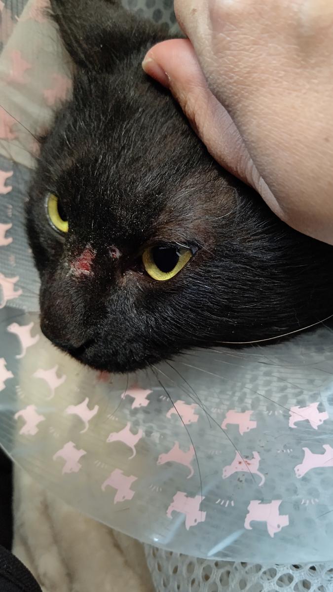 鼻の上の傷は恐らく、ケージをムリムリっと抜け出した時のものでしょう、と。