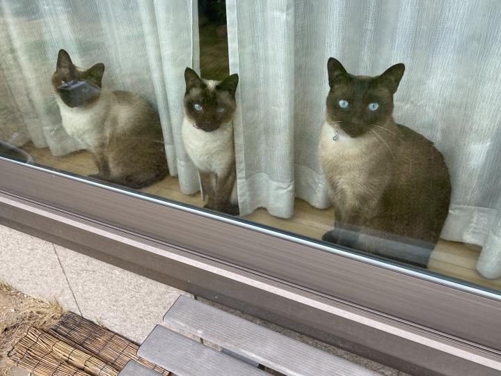 「庭の草むしり(草食い)手伝ってあげるから出して😺」と言っているようですが食べたらキラキラ✨をマーライオンするのが予想出来るのであきらめてもらいました。