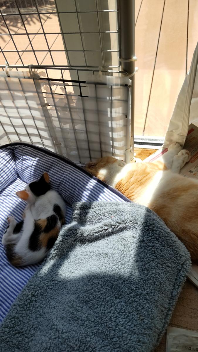 こんな感じです💘まだ、ゆずがあけびを抱っこすることはありませんが、ゆずがあけびを自分の尻尾で遊ばせたりしていて微笑ましいです😺