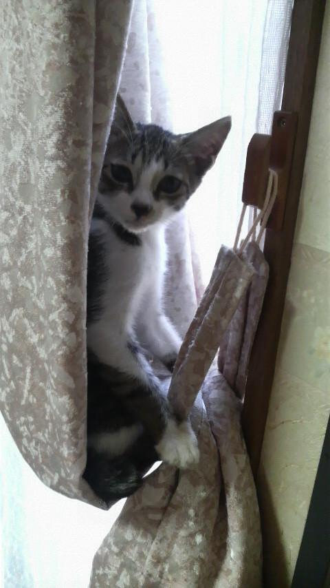 カーテン遊びが大好きで、いい場所見つけて座っていた『たく』 カーテンの一番上まで登りクーラーの上に乗り、最後は降りれ ず泣いています。