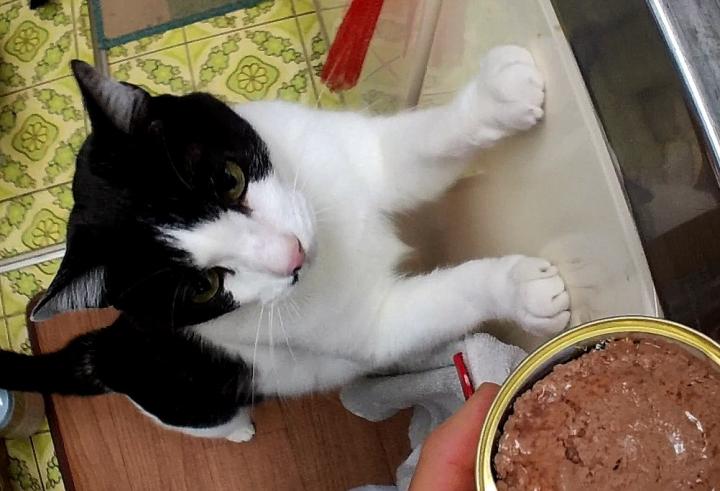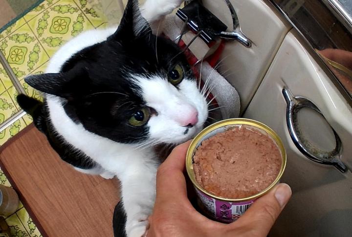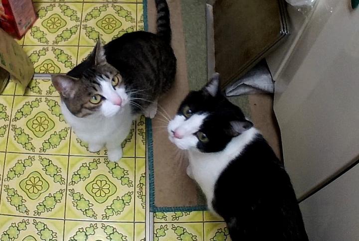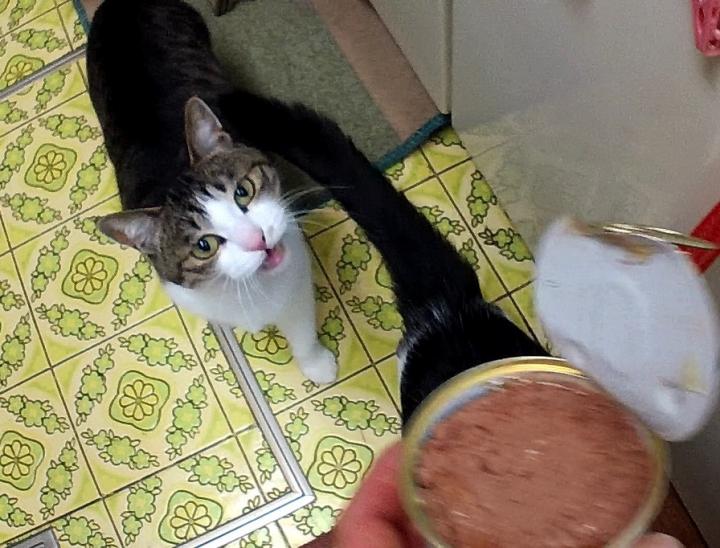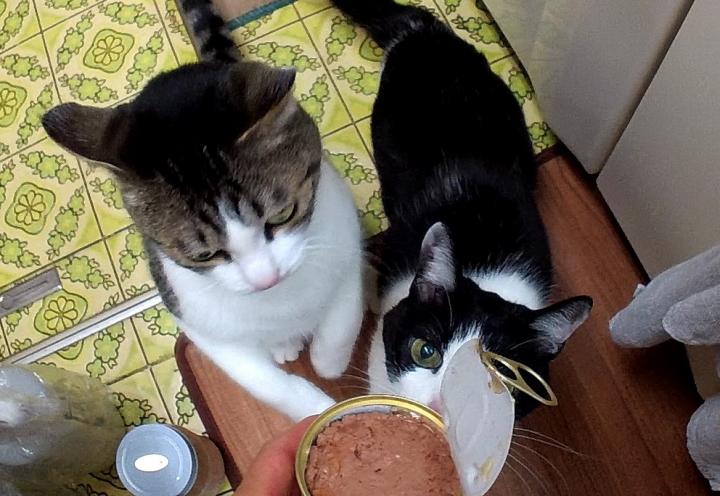 今朝もハチ君と七七保、ふたり揃って缶詰をお目当てにやって来てます。