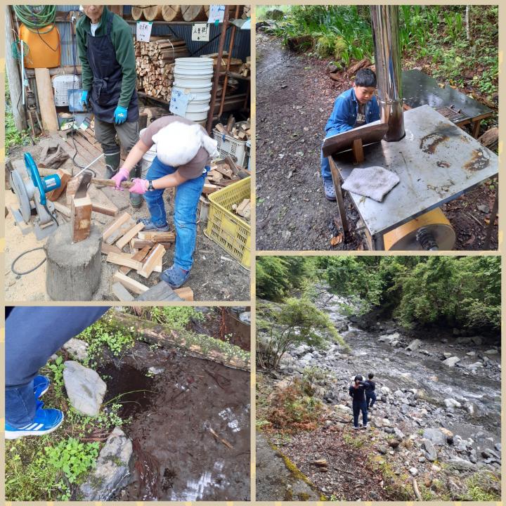 管理人さんと朝から竹箒で場内の掃除をしたり、薪割りのお手伝いをしたり。