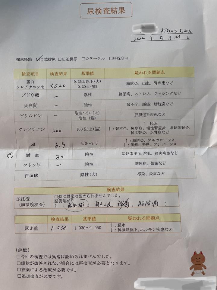 潜血は腎出血の可能性もあるけど、小さい猫は診察が難しいそうで、確定には至らずでした。