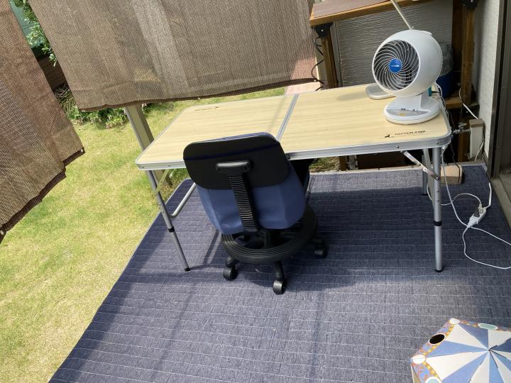 先日日記にあげた、次男坊兄ちゃんのテント勉強部屋ですが、次男坊には狭すぎて頭がつかえたので、テントはしまい、使っていない机や椅子、マット等を置いて、こうなりました。