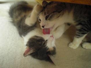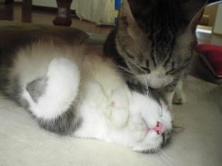 ハル、寝てるモコをわざわざ舐めに行かなくても;