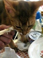 人間用4匹(塩焼き)猫用2匹(素焼き)だったので、先に食べさせないとうるさいだろうなぁ(笑)とお皿にむしってあげてると・・・
