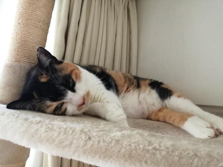 キャットタワーの一番上でお昼寝。