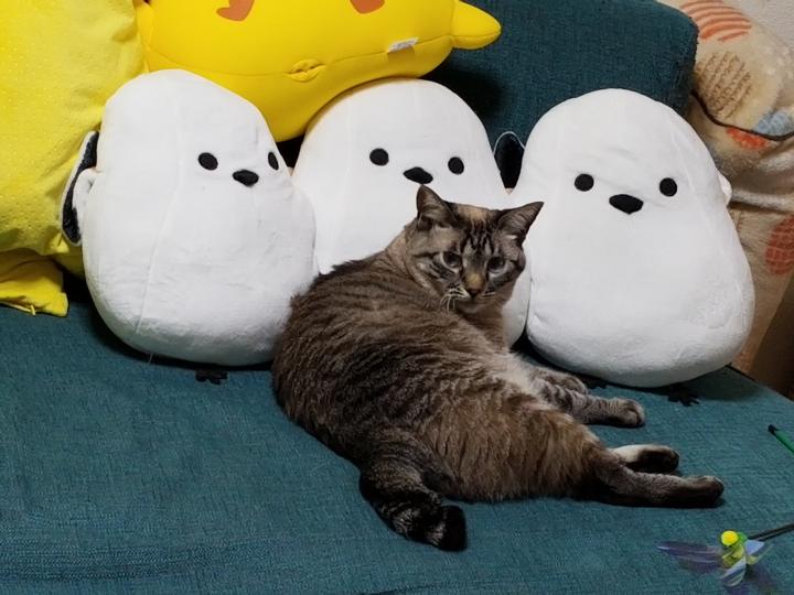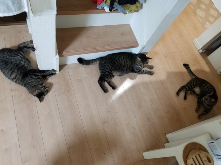 家の中はキジトラ三匹は階段下に並んで寝てます。