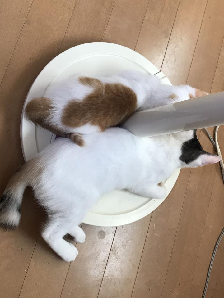 うちでは扇風機の上に乗ります。