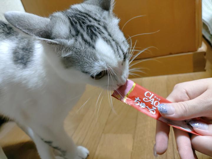 いままでドライとウェットの総合栄養食と水だけしか与えてませんでしたがハーフバースデー、半年を過ぎたので初ちゅーるを与えましたよ!