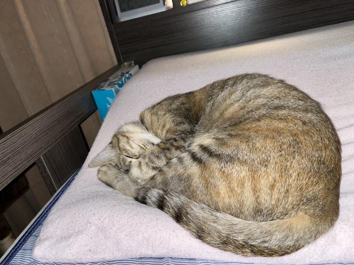 今夜も、私が寝る前のストレッチをリラクゼーションの音楽をかけてしている間に、しれーっと私の枕を陣取って寝ました💤だから、私はいつも片隅に寝てます。が、みかんだから許せる❤️こんなにも懐いてくれると、愛おし過ぎてちょっかい出してまーす(笑)