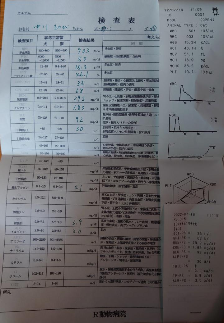 あまり病院に頻繁に連れて行きたくないから血液検査もしてもらった!少しだけ白血球が少ないけど腎臓や肝臓は異常なしとの事ですごく安心。本当に良かった。