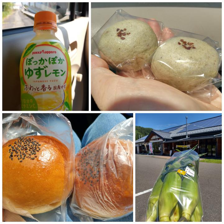 昼神温泉にも立ち寄り、せっかくなのでここでもトウモロコシ(写真無)と蕎麦饅頭(右上)