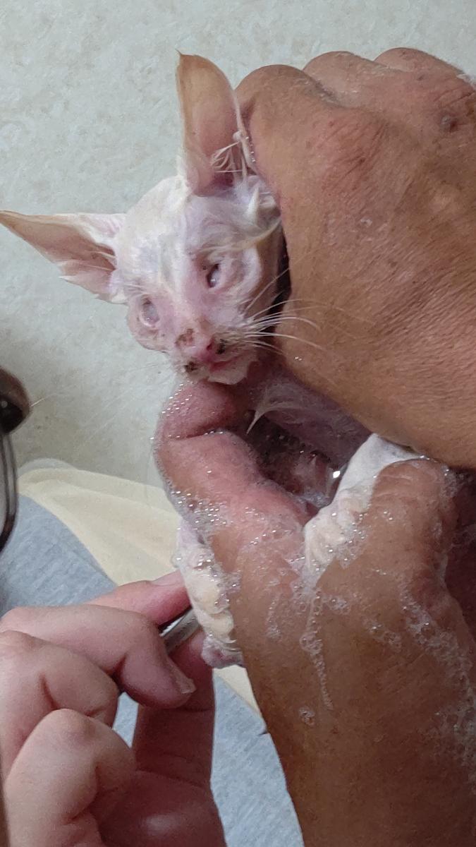 白猫は♂️と♀️で、♀️がかなり弱ってました。先生から、白猫達は亡くなるかもしれないと言われました。目がみえていない♂️はミルク、離乳食をパクパク食べましたが……♀️は全く食べないのでスポイドを使い食べさせていました。2日後亡くなりました………♂️はパクパク食べて元気に成長中です。