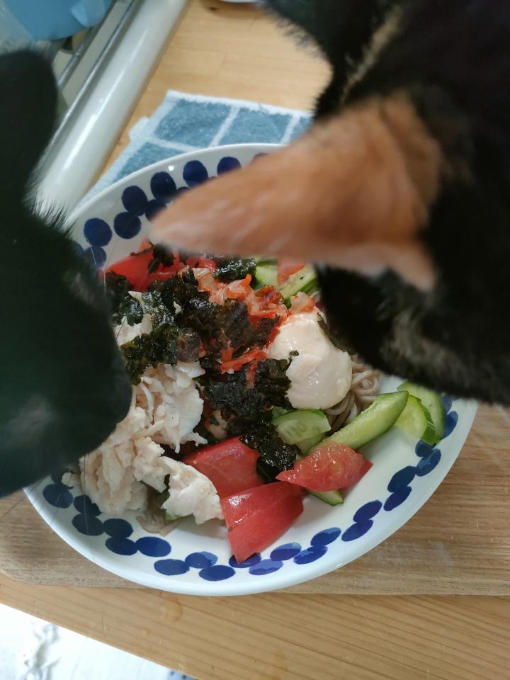 (現場を📷撮ろうと、あえてユルくしております) 警備をゆるめると手を出してボウルからすくい落として食べてちまう。