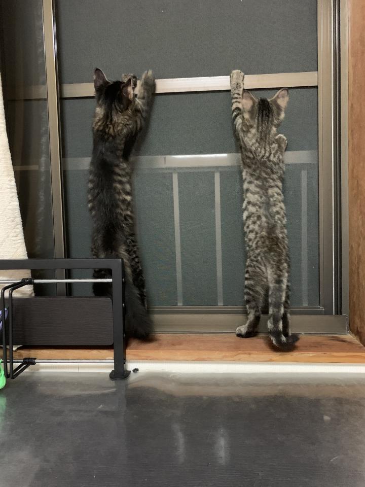 網戸に来た虫に興味深々