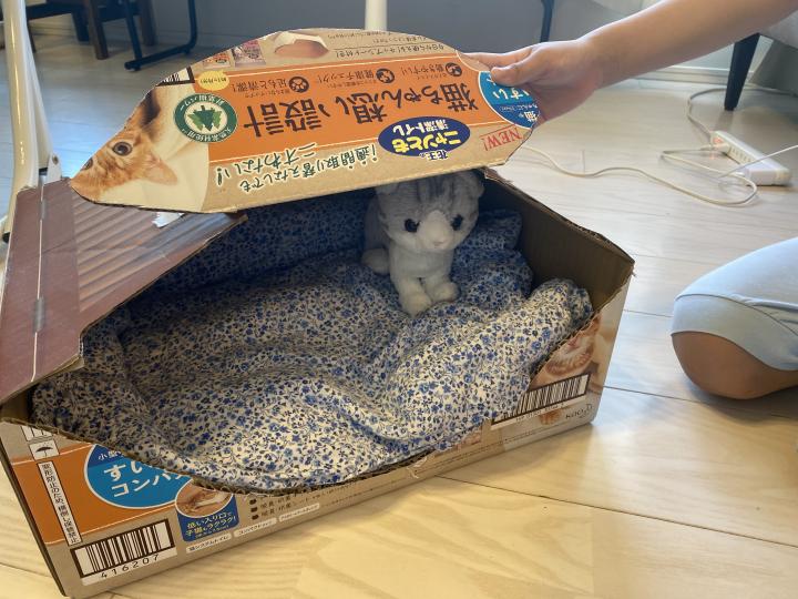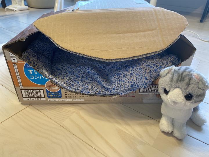 今日はダンボールでベッドを作りました。気に入ってくれるかな?