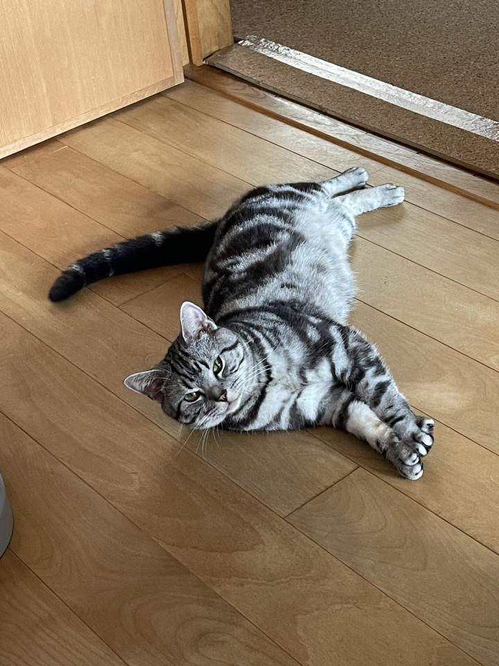 コタローが床に同化するのも仕方ないですね。冷感ハンモックもお気に入りですが、床に伸びる方が楽そうです。